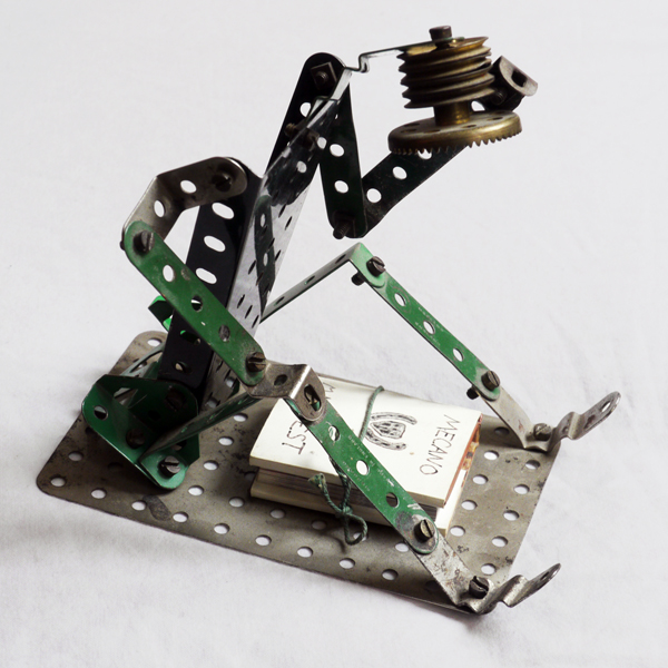 The work of Dirk Polak is entirely based on the toy Meccano, invented in 1901 by the Englishman Frank Hornby with the intention of educating the "engineers of tomorrow". Dirk Polak began to produce his works in the late seventies and still today his art draws inspiration from the English toy. He tries to combine his passion for Surrealism (De Chirico and Max Ernst), Dada, Futurism and Constructivism. Mysterious figures such as "The Thinker" The Boxer”, "Mechanical butterflies" or "The owl" populate his works, and are often placed in a dreamy and odd context. The result is amazingly strong and aggressive as a constructivist workand, at the same time, poetic and ambiguous like a surrealist piece. The toy intended for "engineers of tomorrow" becomes a form of art of visionary and evocative characteristics. The dichotomy of a child destined to lose its innocence and become a cold and pragmatic constructor is inverted: the artist looking at the world through the eyes of a child uses the mechanical toy to create poetic symbols whose sole purpose is to nourish the intellect and spirit.